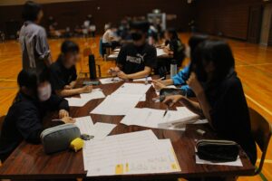 始めに、大地震が起き火災が発生した想定での避難訓練を行いました。